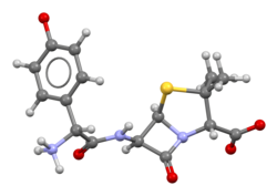 아목시실린은 베타-락탐 항생제로서 페니실린 결합 단백질(penicillin-binding proteins, PBPs)에 비가역적으로 결합합니다. 구체적으로, 아목시실린의 베타-락탐 고리는 박테리아 세포벽 합성에 필요한 천연 기질(D-Ala-D-Ala peptide)의 구조를 모방하여 PBP3의 활성 부위에 결합합니다. 이렇게 결합한 아목시실린은 Ser294 잔기와 공유 결합을 형성하여 펩티도글리칸의 교차결합(cross-linking)을 방지합니다. 그 결과 박테리아 세포벽의 구조적 무결성이 손상되어 삼투압 스트레스가 발생하고, 결국 세포벽이 붕괴되면서 박테리아가 사멸합니다.